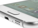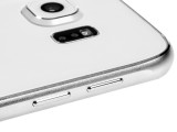 The Samsung Galaxy S6 has a metal frame, which is exposed on the sides, and Gorilla Glass 4 on the front and back. The two glass panels have a slight bevel on their side, but the transition isn't as smooth as on the iPhone. The metal sides are squared off too so that the side buttons do not sink into the body of the phone.